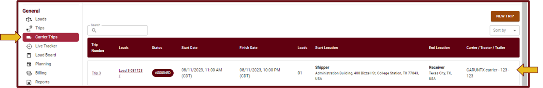 You can find all the loads that have been assigned to carriers in 'Carrier Trips' on the left side menu.