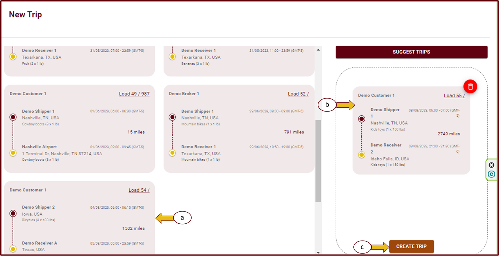 - You can either use the drag and drop function to move loads (a) into the block under 'Suggest Trip' (b) in order to create a trip with that carrier. Once you have followed this step, select 'Create Trip (c)