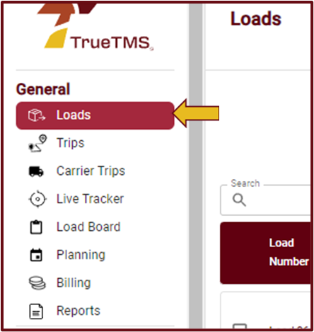 - Log in to TrueTMS on the web application. On the menu on the left of your home screen under the General section, click on ‘Loads’