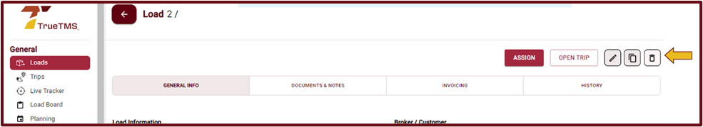 - From the list of loads displayed, search for the load you wish to delete and click on the load. The load information page will open where you can select the bin icon on the top right.