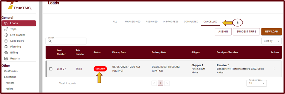 - The load can now be found under the CANCELED loads filter (a) on the loads page with a ‘deleted’ status.