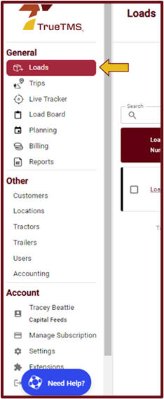 - Log in to TrueTMS on the web application. On the left side menu under General select ‘Loads’.
