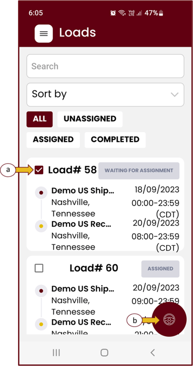 - Look for the load you wish to edit and click the check box next to the load number (a) followed by the maroon steering wheel icon (b) in the bottom right corner.
