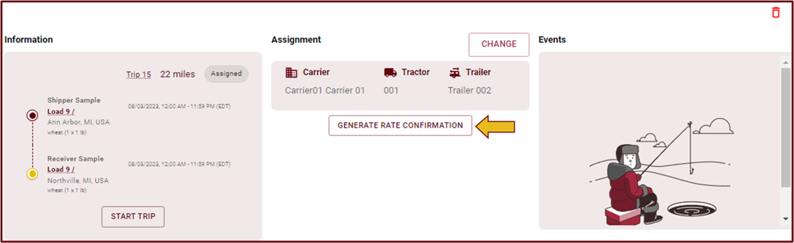 - After opening the loads screen, you will see that the load is assigned to your carrier under the Assignment section. To proceed, simply select 'Generate Rate Confirmation' located just below the carrier assignment.