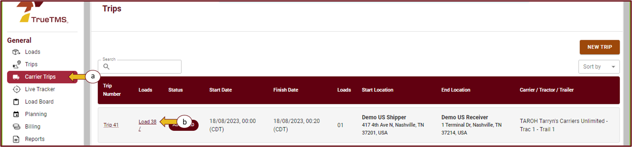 - To access TrueTMS on the web application, log in first. Then, navigate to the menu on the left side of your home screen and select 'Carrier Trips' under the General section. Once the page loads, click on the specific load for which you would like to generate a Ratecon.
