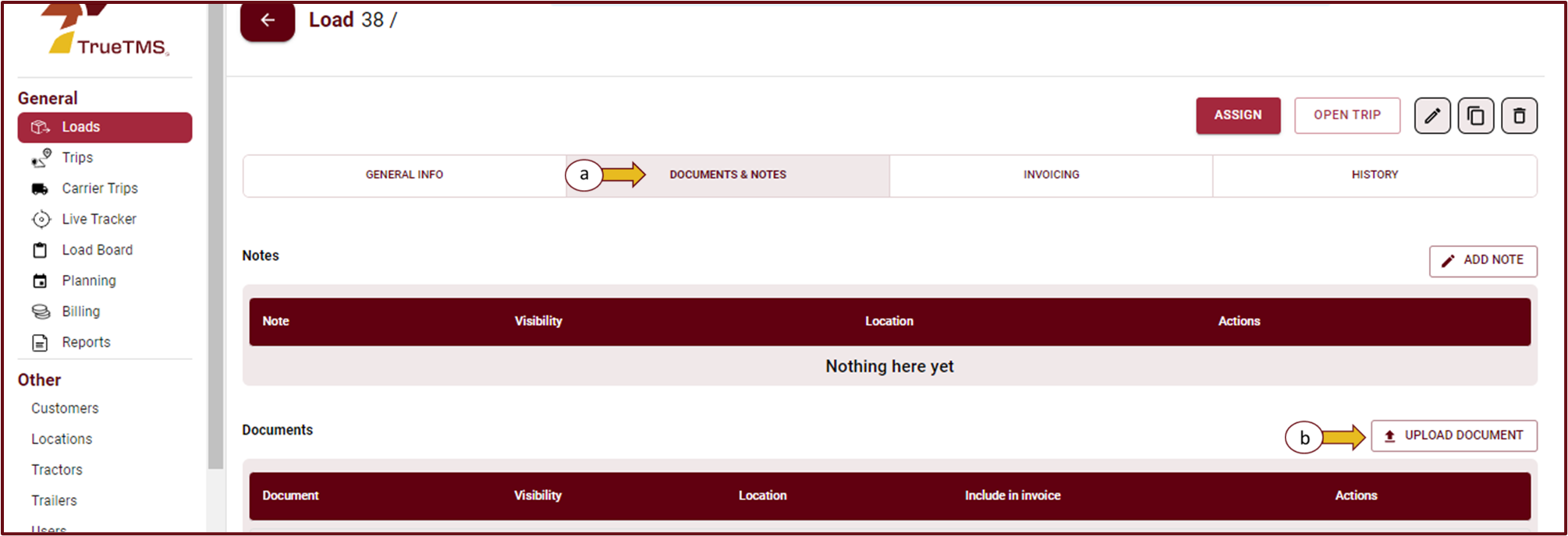 - Once the loads page has opened select 'Documents & Notes' (a) from the top tab menu. Navigate down to the Documents section and select 'Upload Document'