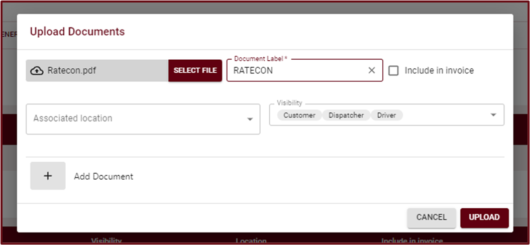 - To upload the file, you have the option to either drag and drop it or select it manually. Fill in all the necessary information in the pop-up window. If you want the Ratecon to be attached to the invoice, remember to check the box next to Include in invoice before selecting 'Upload'.