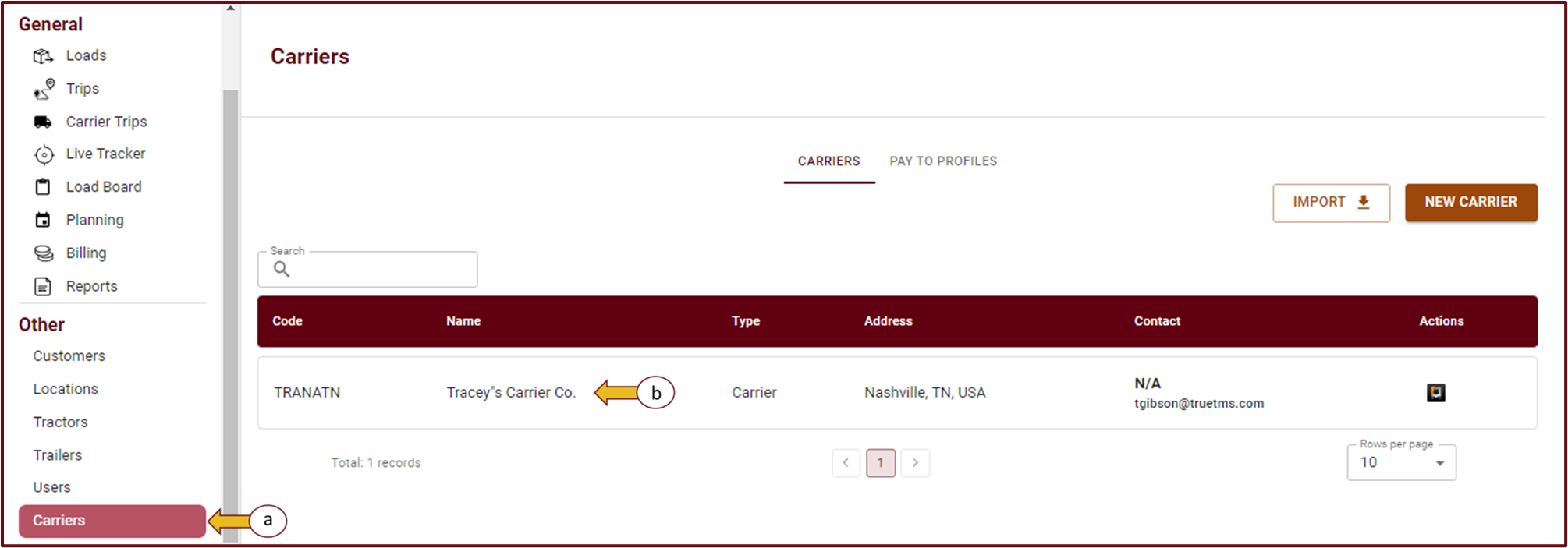 - To access TrueTMS on the web application, start by logging in. Then, on the left side of your home screen, find and select the 'Carriers' option (a) located under the Other section.