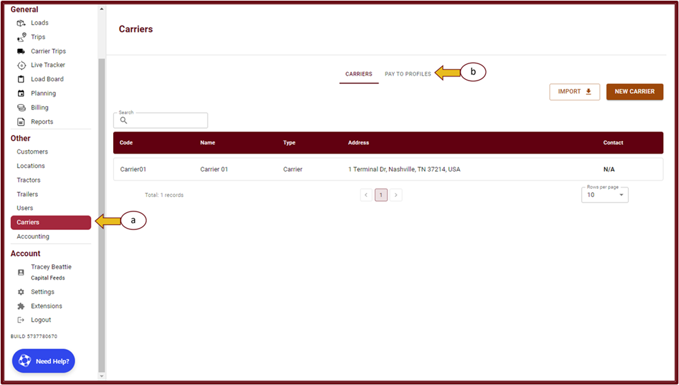 - To access TrueTMS on the web application, start by logging in. Then, navigate to the menu on the left side of your home screen and click on 'Carriers' under the Other section. Next, at the top of the screen, select 'Pay To Profiles'.