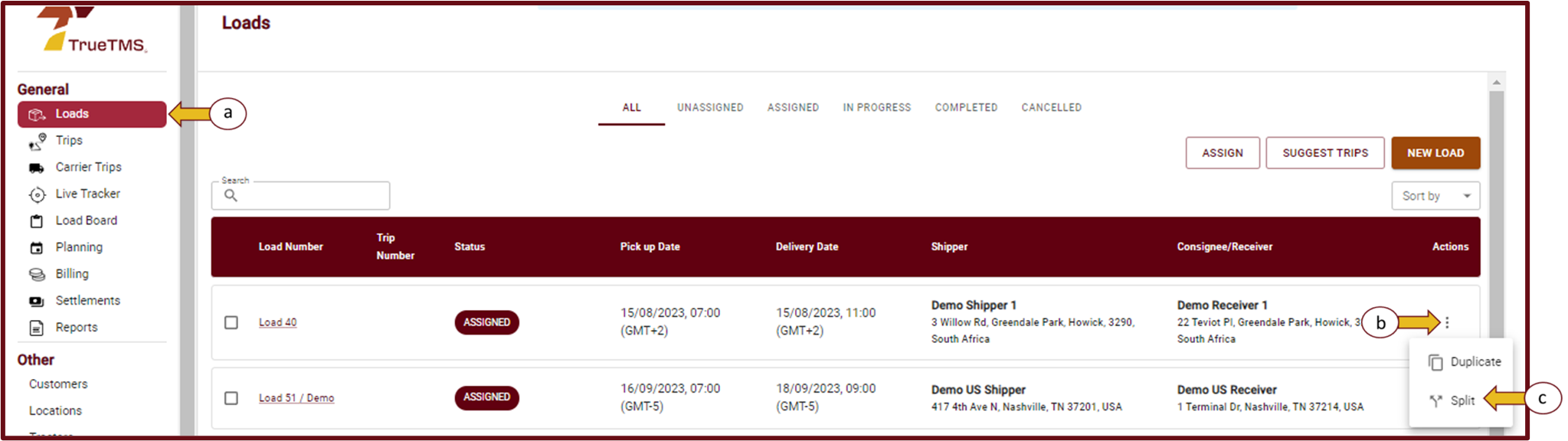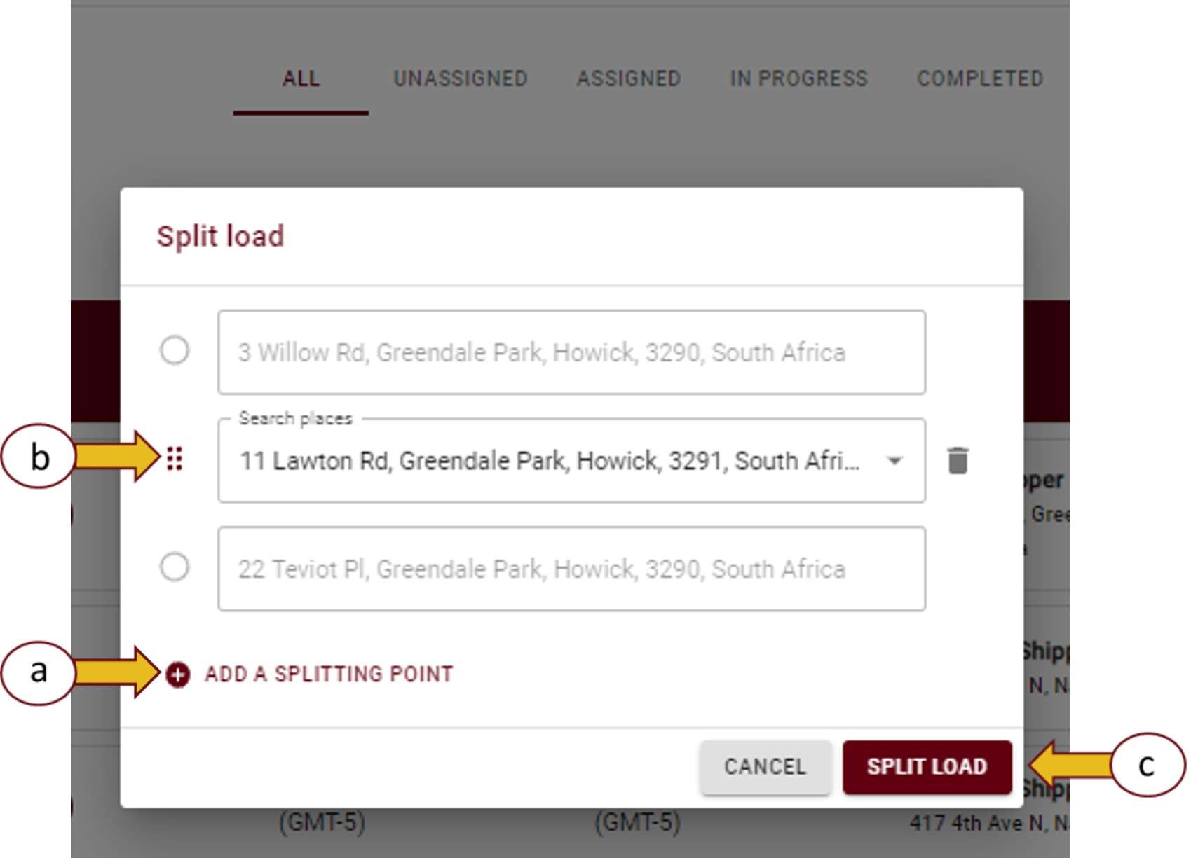 To initiate the splitting process, click on the ‘more’ option (represented by three dots next to the load) that you wish to split (b). Now select the ‘Split’ option (c).