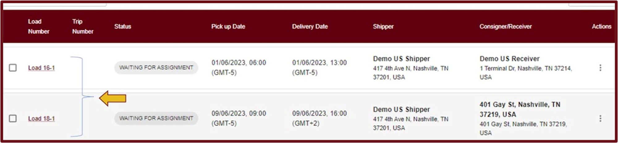 - From your Loads page you should see both loads are now assigned and each of the ‘legs’ (splits) of this load has its own trip.