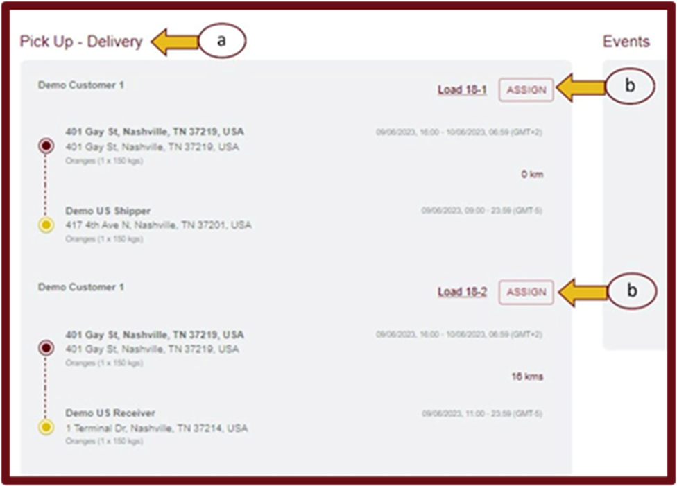 - To assign the splits, you have two options. You can either click on 'waiting for assignment' from your Loads page or go back into the load. Once inside, scroll down to Pick Up - Delivery (a) where you will find the options to assign the individual splits to a driver, trailer, and tractor (b).