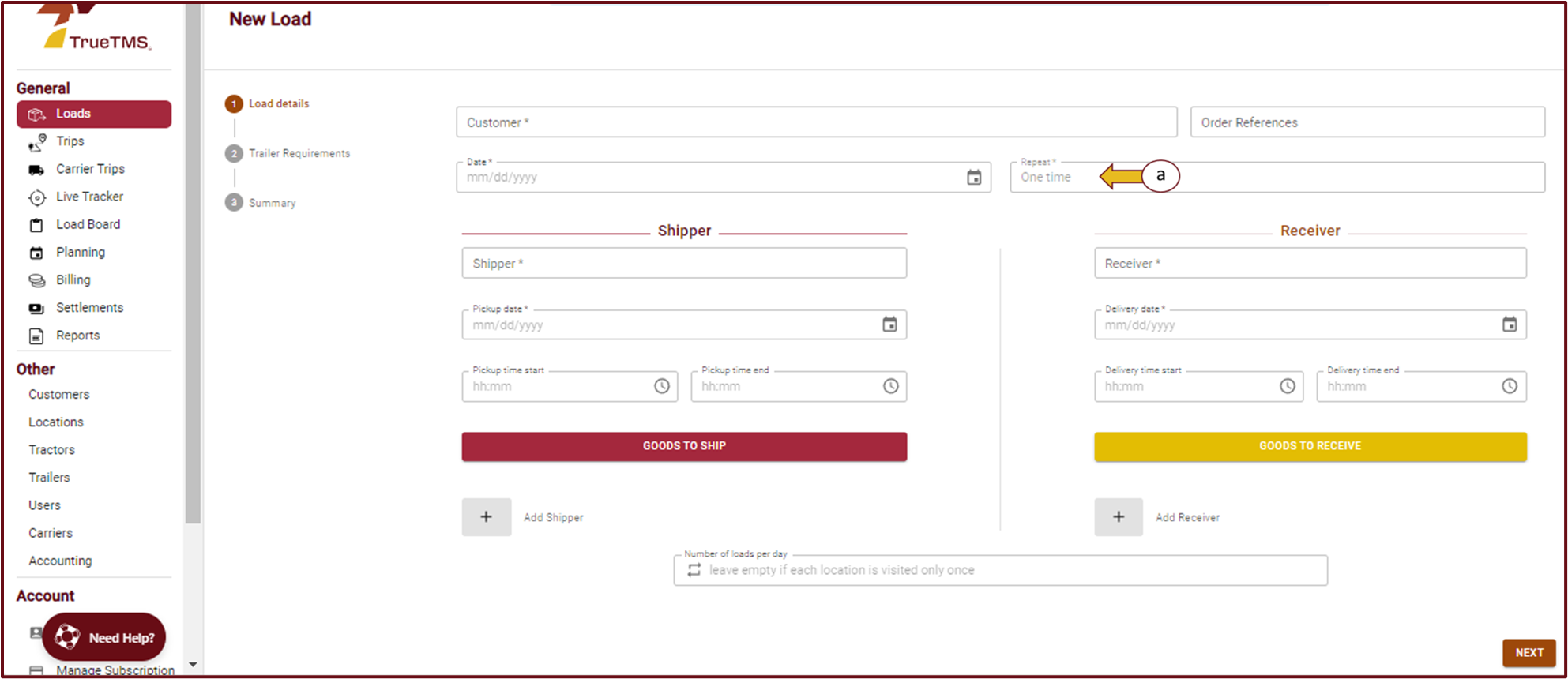 - Log in to TrueTMS on the web application. On the menu on the left of your home screen under the General section, click on ‘Loads’ (a) and then ‘New Load’ (b).